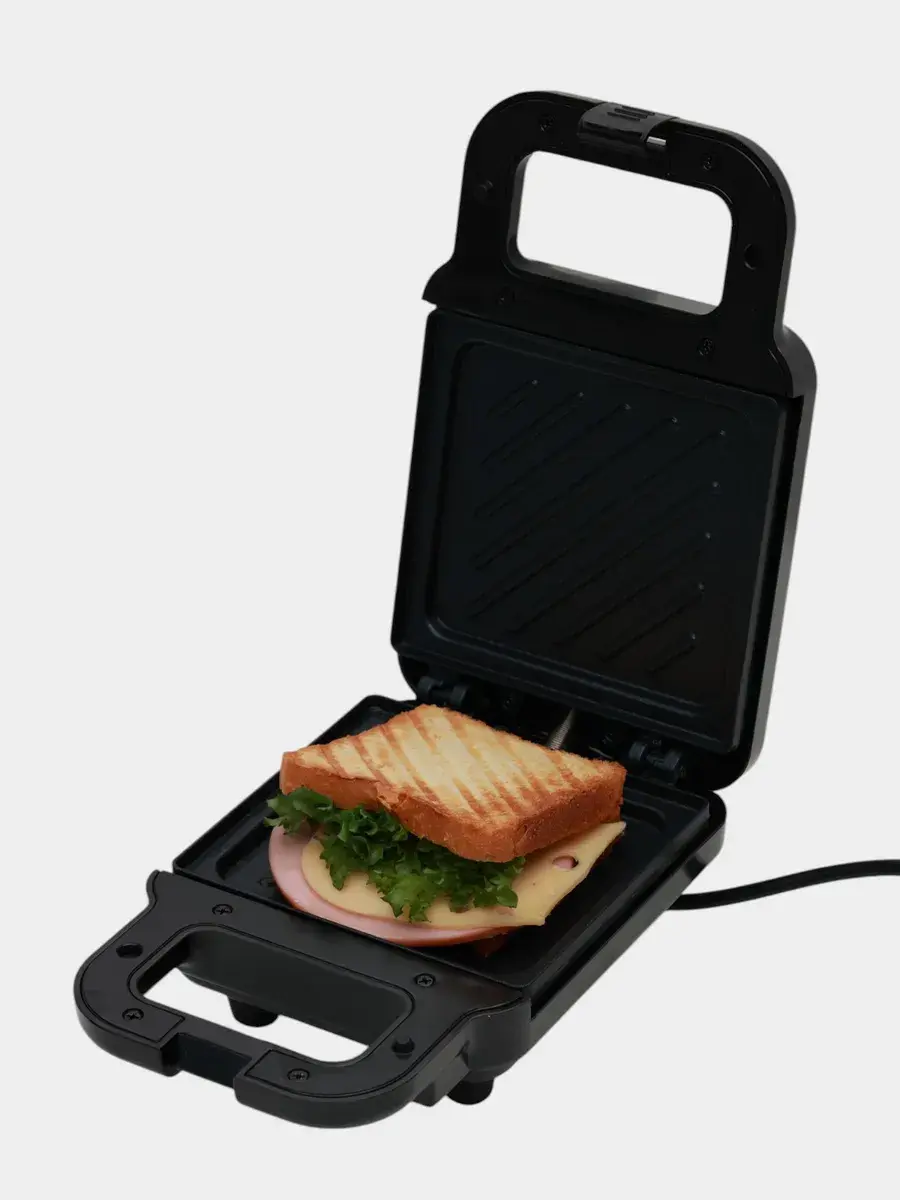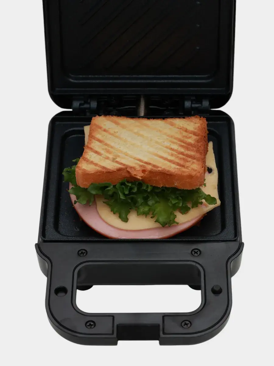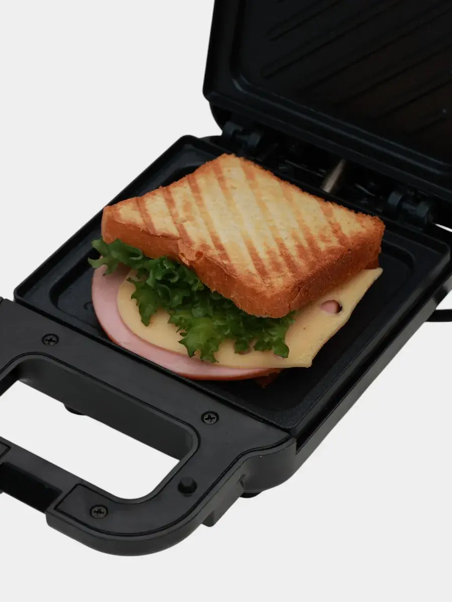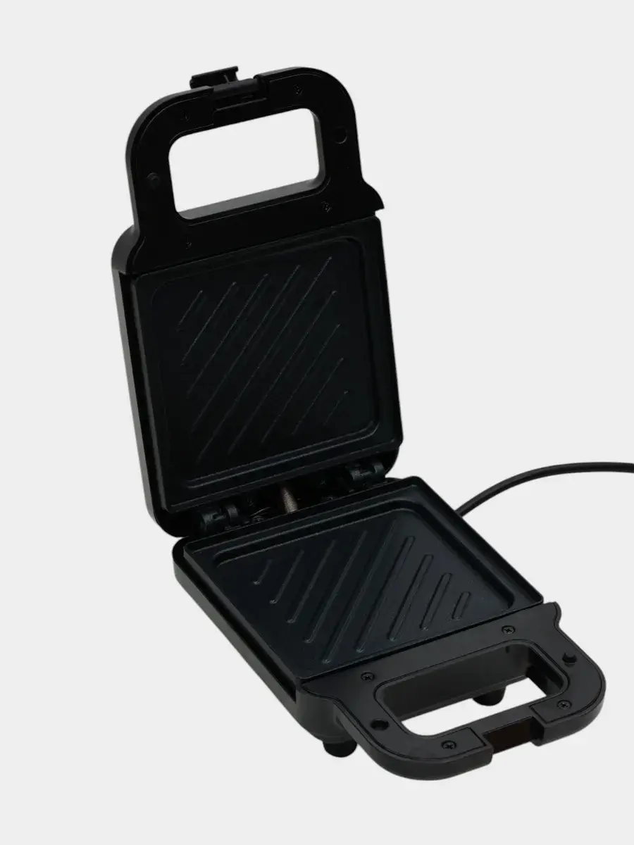 Двойной нагрев для равномерного приготовления сэндвичей сверху и снизу, удобное антипригарное покрытие для приготовления без масла, механический замок для безопасного использования, индикатор включения для контроля работы.