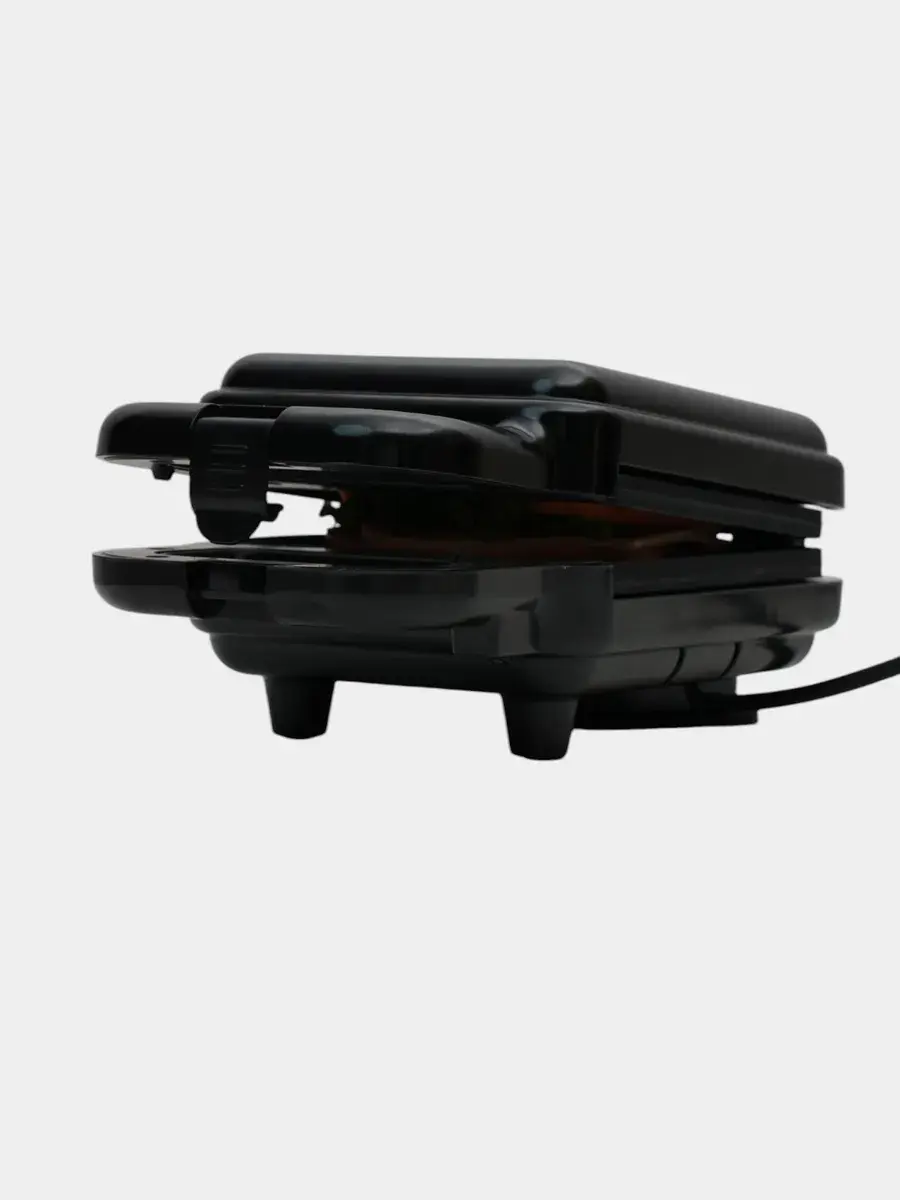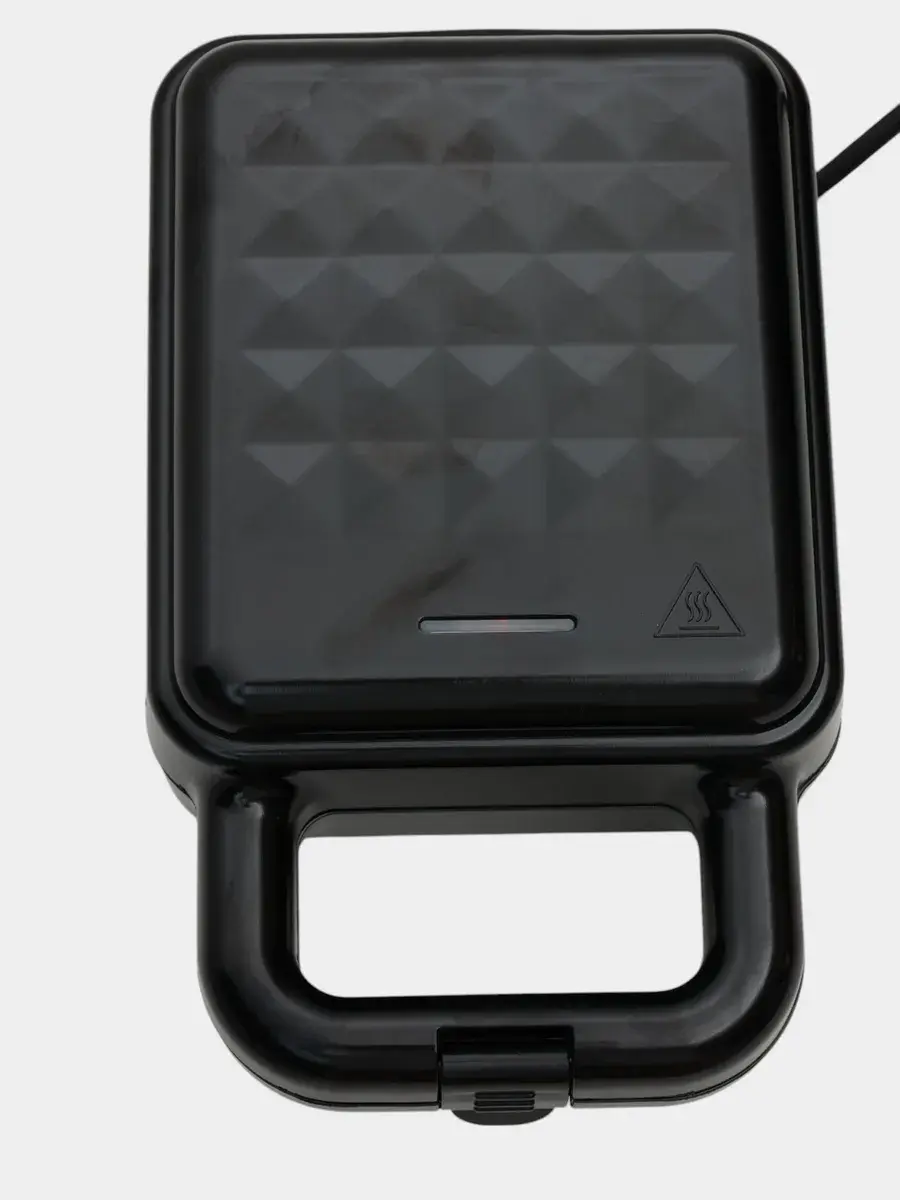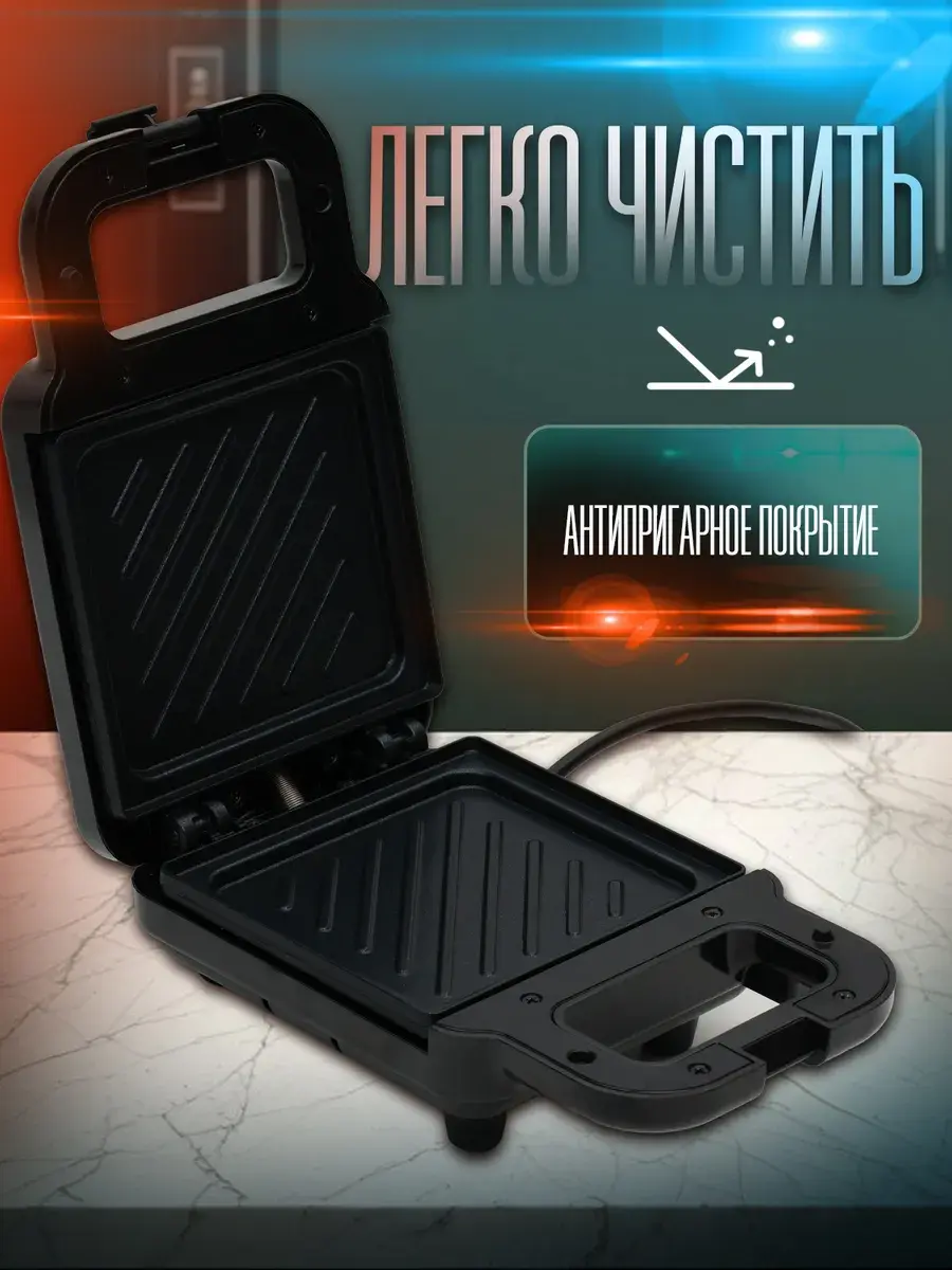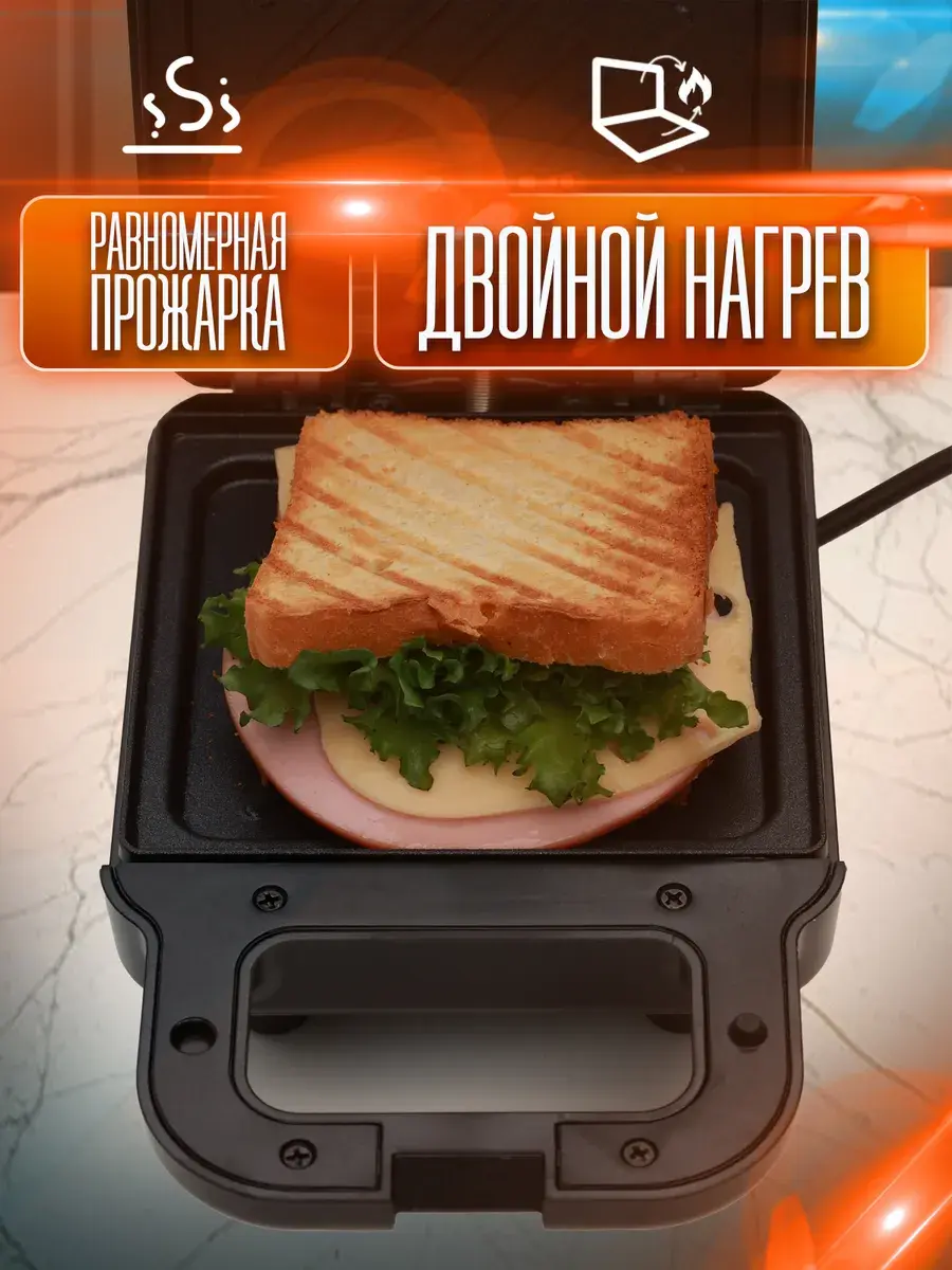 Двойной нагрев для равномерного приготовления сэндвичей сверху и снизу, удобное антипригарное покрытие для приготовления без масла, механический замок для безопасного использования, индикатор включения для контроля работы.