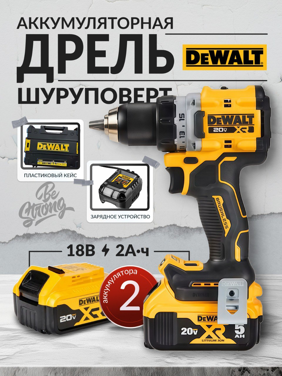 Комплект включает две литий-ионные батареи 20 В ёмкостью 5 А·ч, которые обеспечивают длительное время работы. Прочный кейс Tstak облегчает хранение и транспортировку.