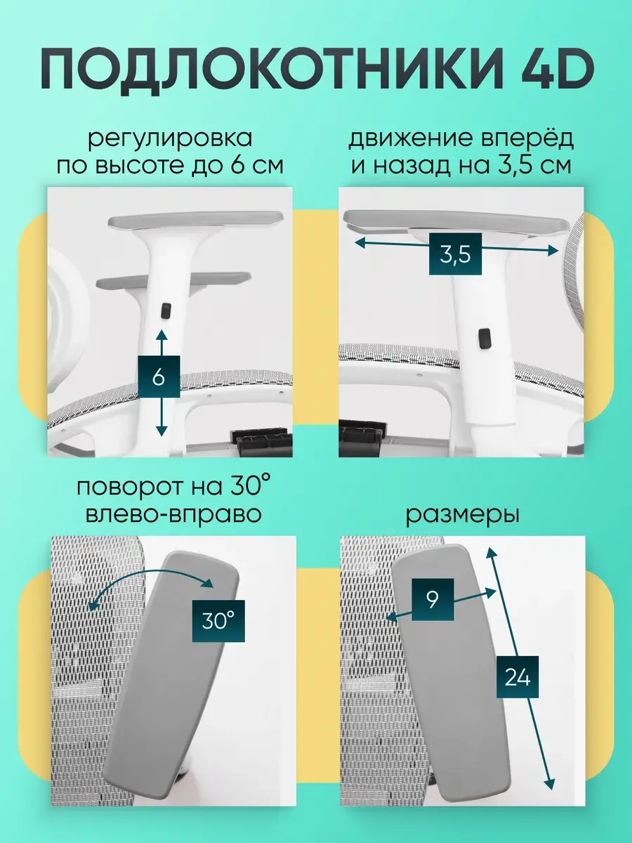 - Удобные 4D подлокотники способствуют снятию напряжения с рук и плеч.