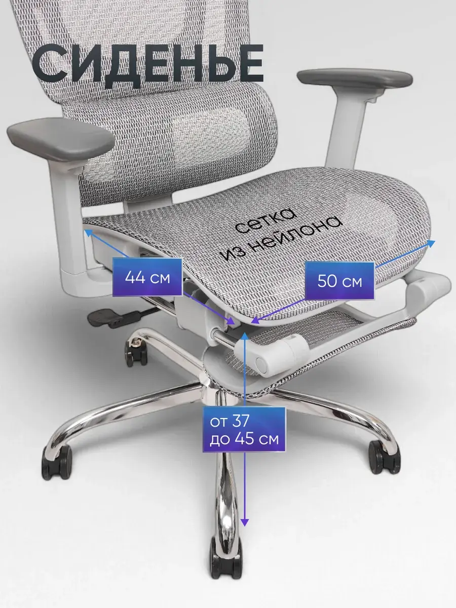 - Сиденье: Ширина — 50 см, глубина — 44 см; высота от пола регулируется от 37 до 45 см.