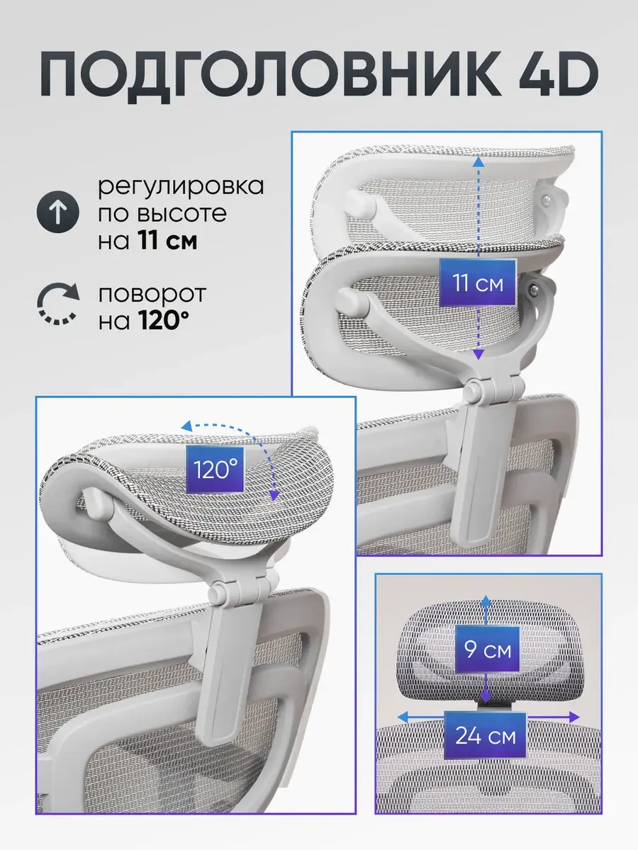 - Подголовник 4D: Регулируется по высоте до 11 см, поворачивается на 120°, обеспечивая поддержку шеи и головы.