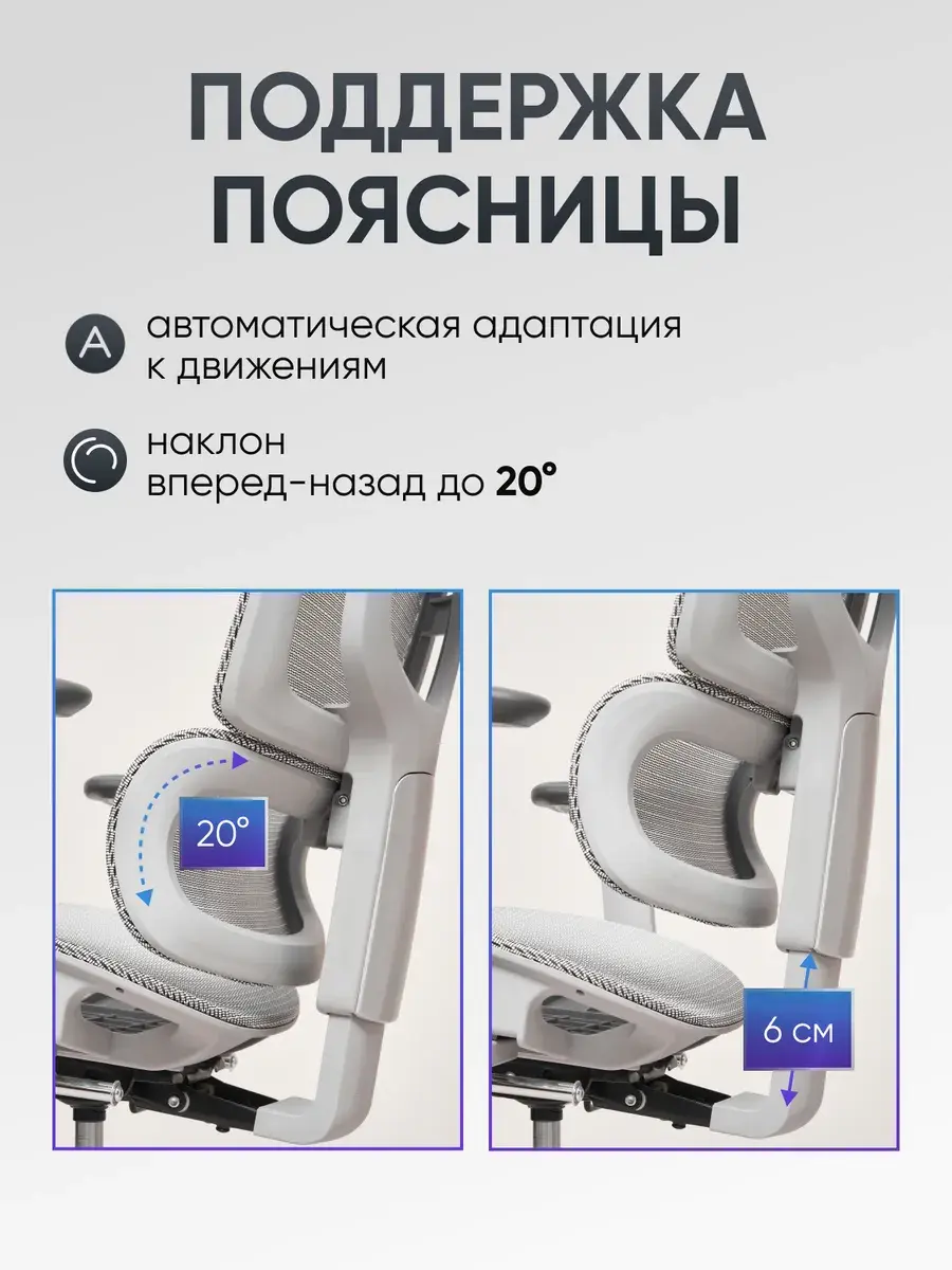 - Поддержка поясницы: Автоматическая адаптация к движению пользователя с возможностью наклона вперед-назад на 20°, что обеспечивает оптимальную поддержку поясницы в любой позе.