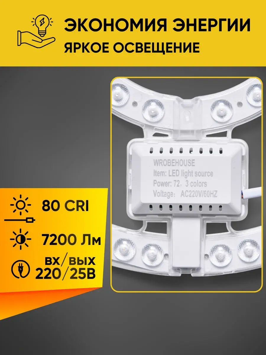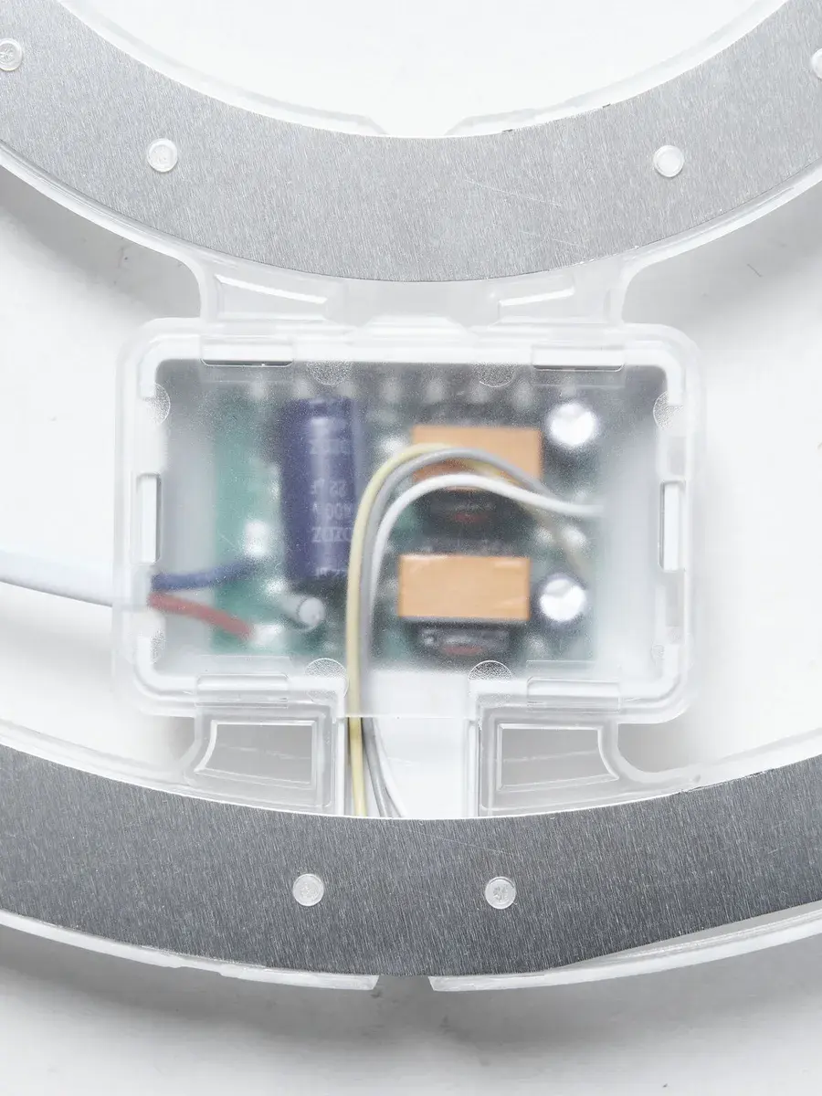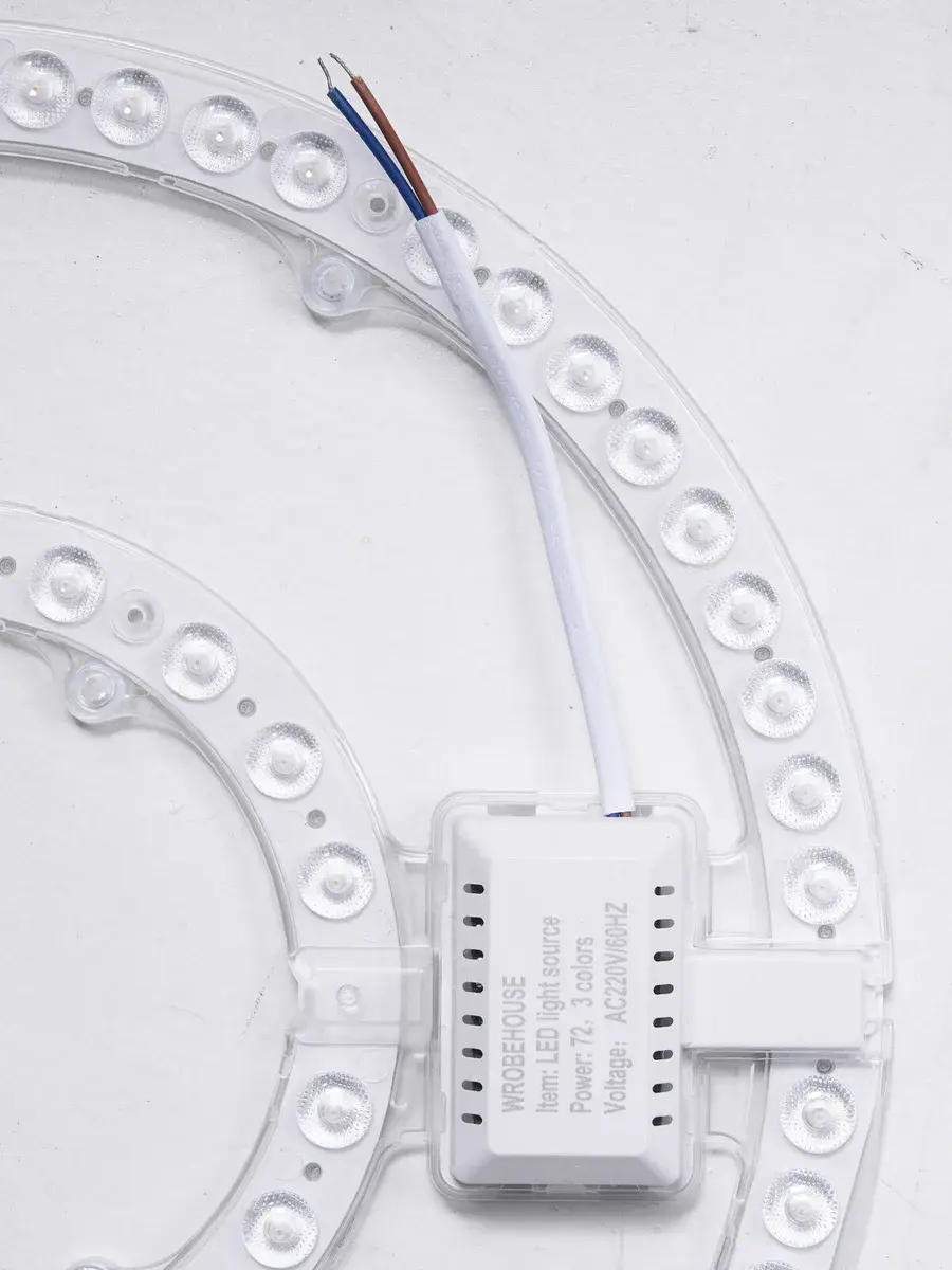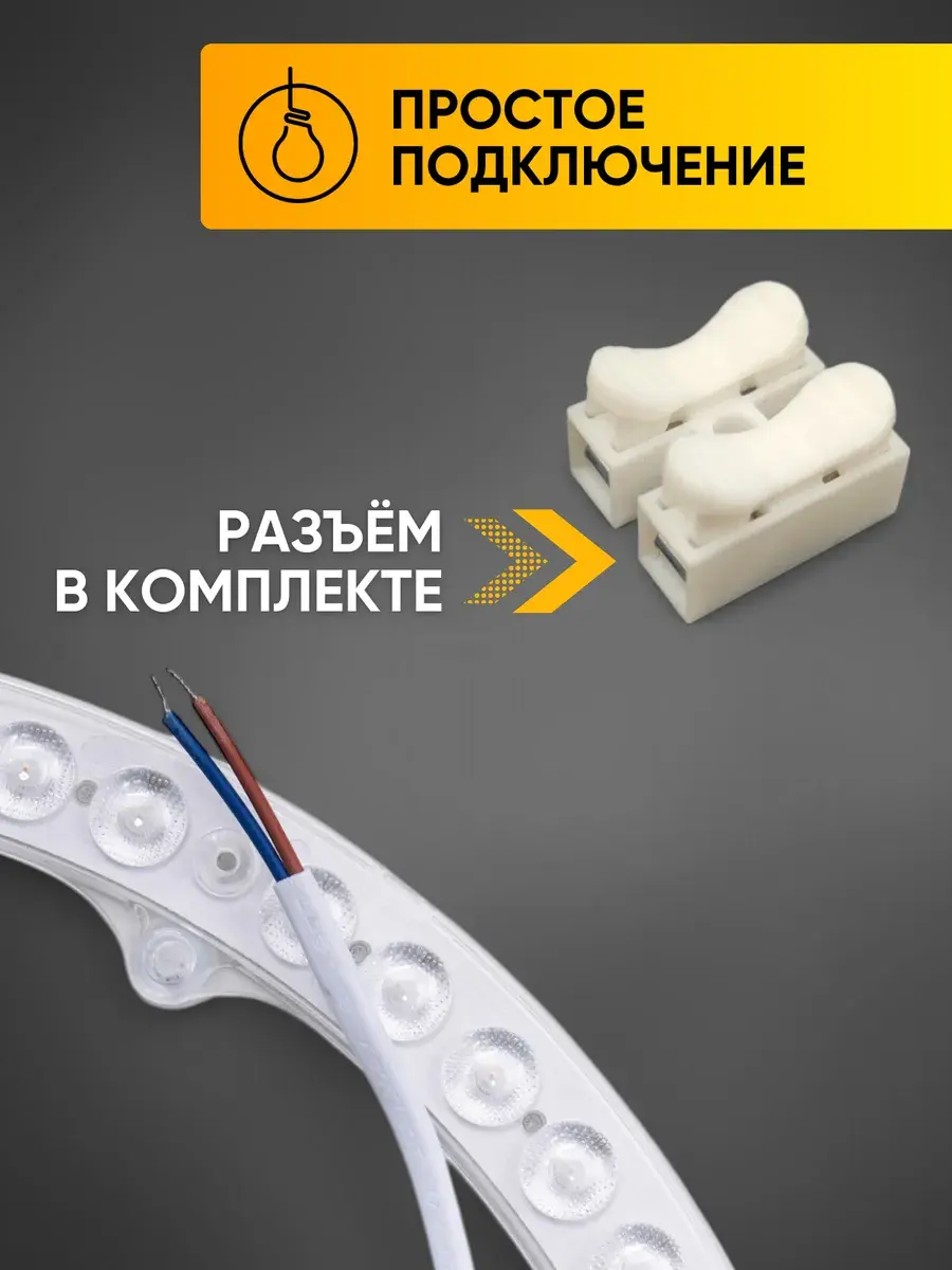 - Комплектация: Включает 2 тонких провода с разъемом для подсоединения к люстре и специальный коннектор для соединения через провода. Подсоединение к светодиоду осуществляется через разъем, к люстре — через провода.