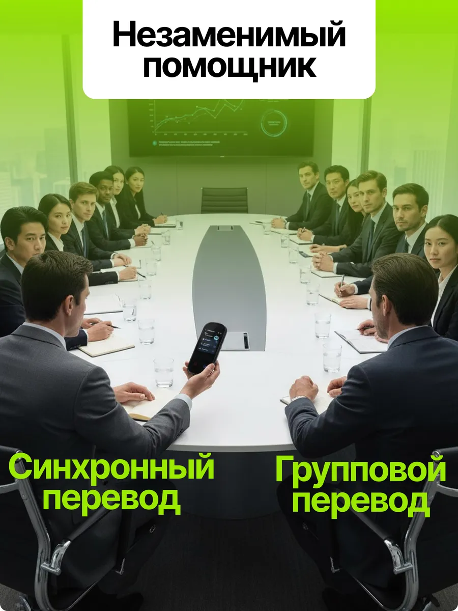 Синхронный перевод: Естественный двусторонний разговор без пауз. Групповой режим: Идеален для деловых переговоров и международных встреч. Фотоперевод: Мгновенный перевод текста с фото для 75+ языков. Голосовой ввод: Просто говорите — устройство всё поймёт и переведёт.