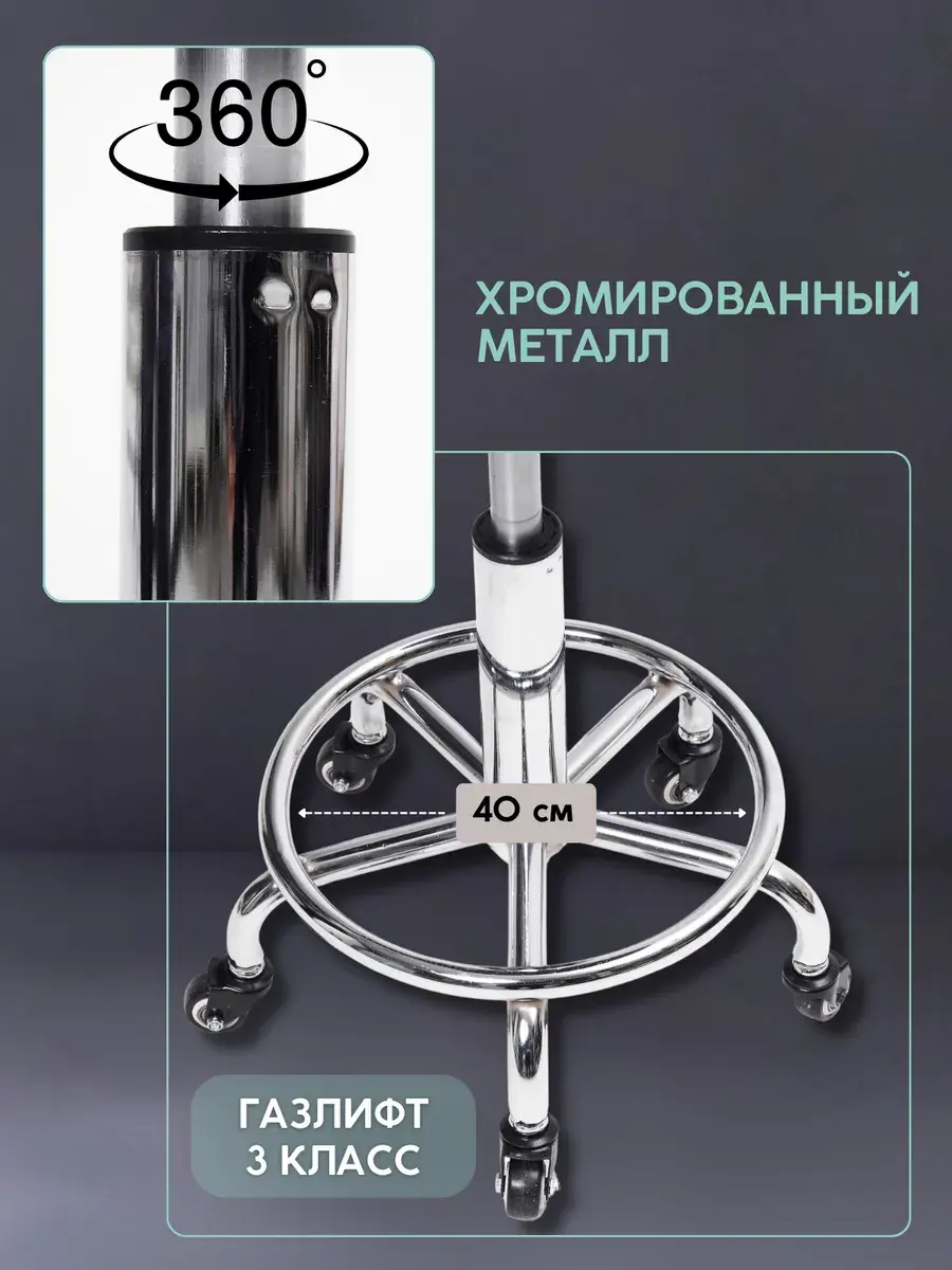 НАДЕЖНАЯ КОНСТРУКЦИЯ Прочная хромированная крестовина стула с пластиковыми колесиками гарантирует устойчивость и легкое перемещение мебели. Газлифт 3 класса позволяет регулировать высоту сиденья, адаптируя кресло под пользователя.